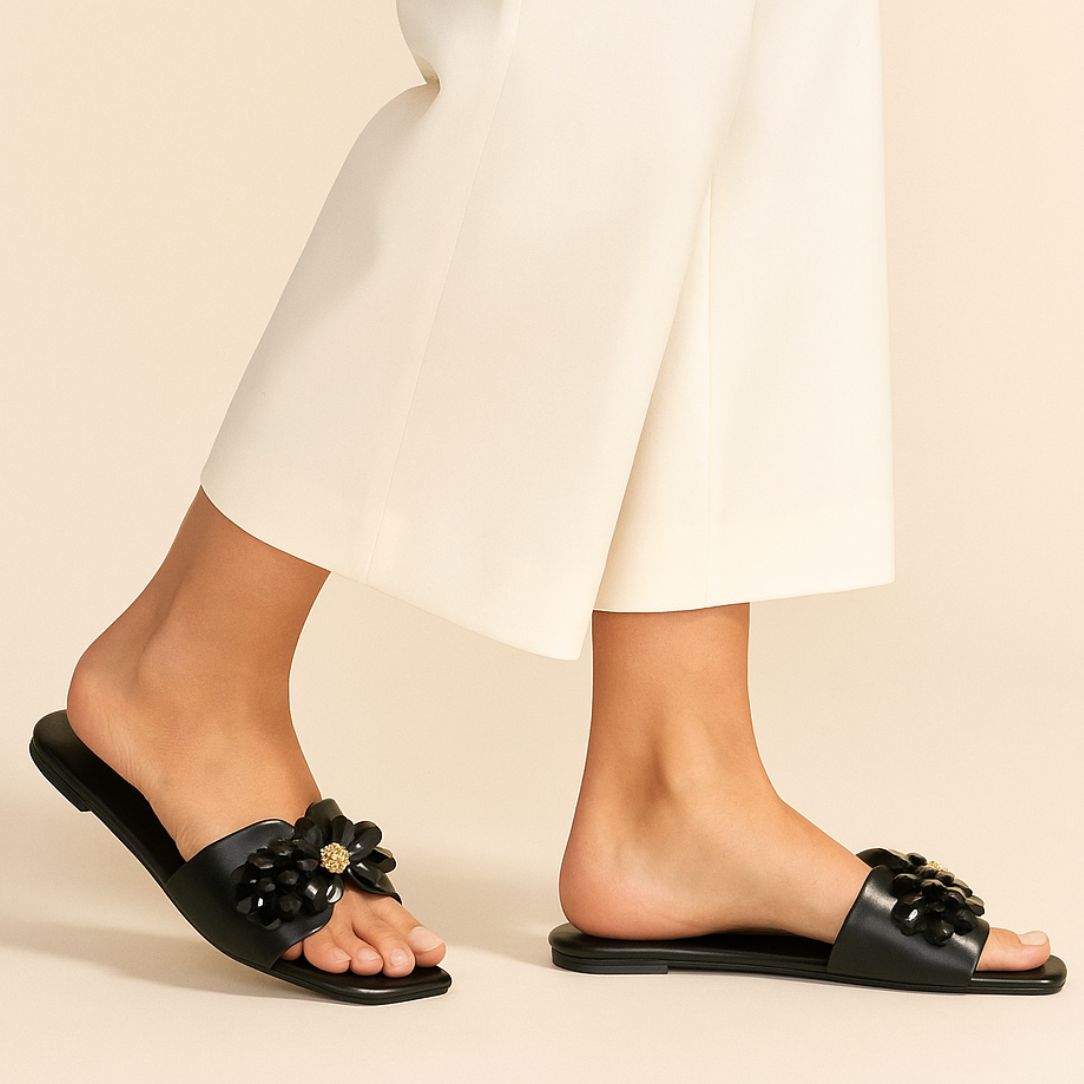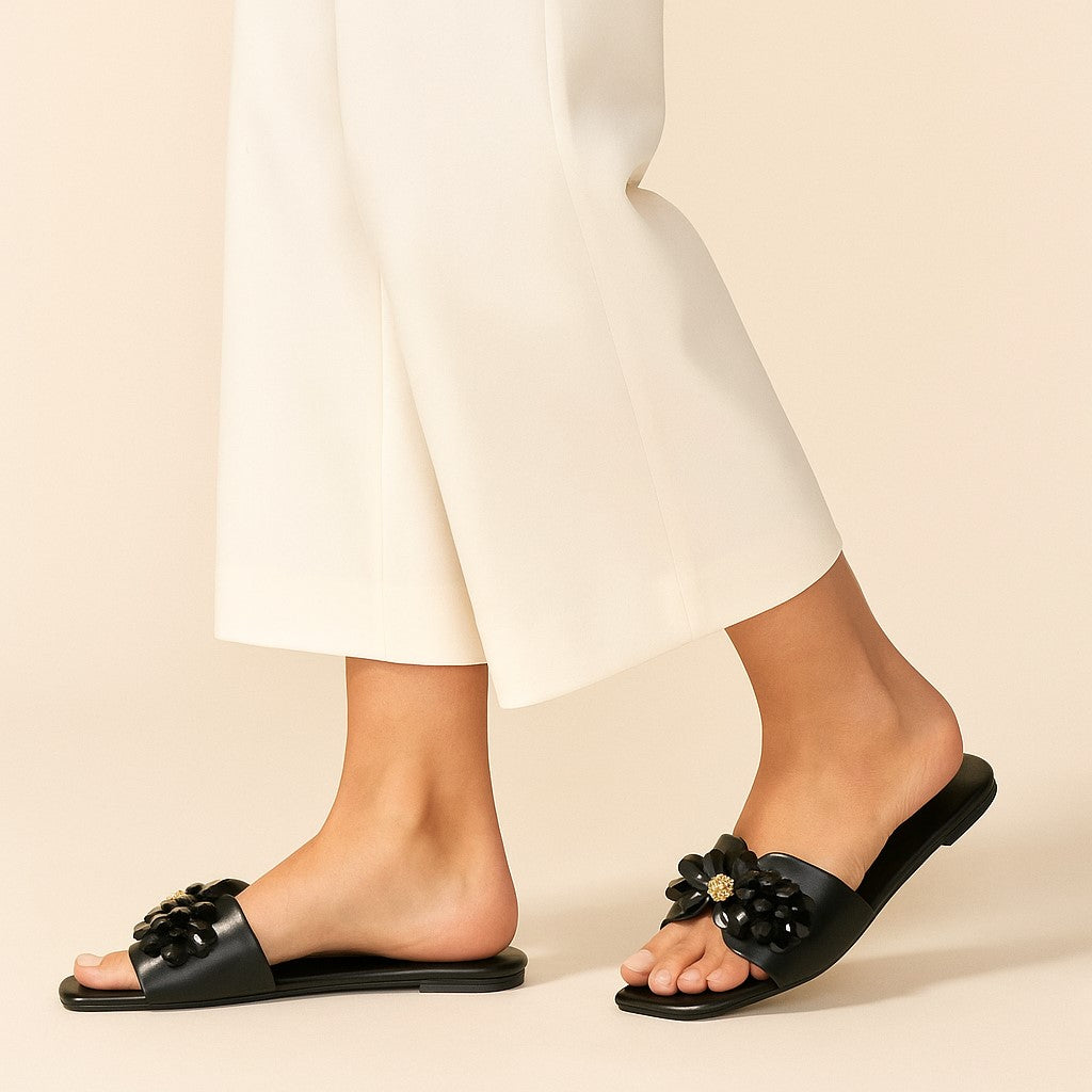 Step into elegance with these striking black slide sandals by ZAPATLA. Crafted with a sleek square-toe silhouette, this statement piece features a bold floral embellishment made from glossy black crystal beads and a touch of gold at the center, adding a hint of sparkle. The wide strap ensures a secure fit while elevating your look with chic sophistication—perfect for both casual outings and festive gatherings.