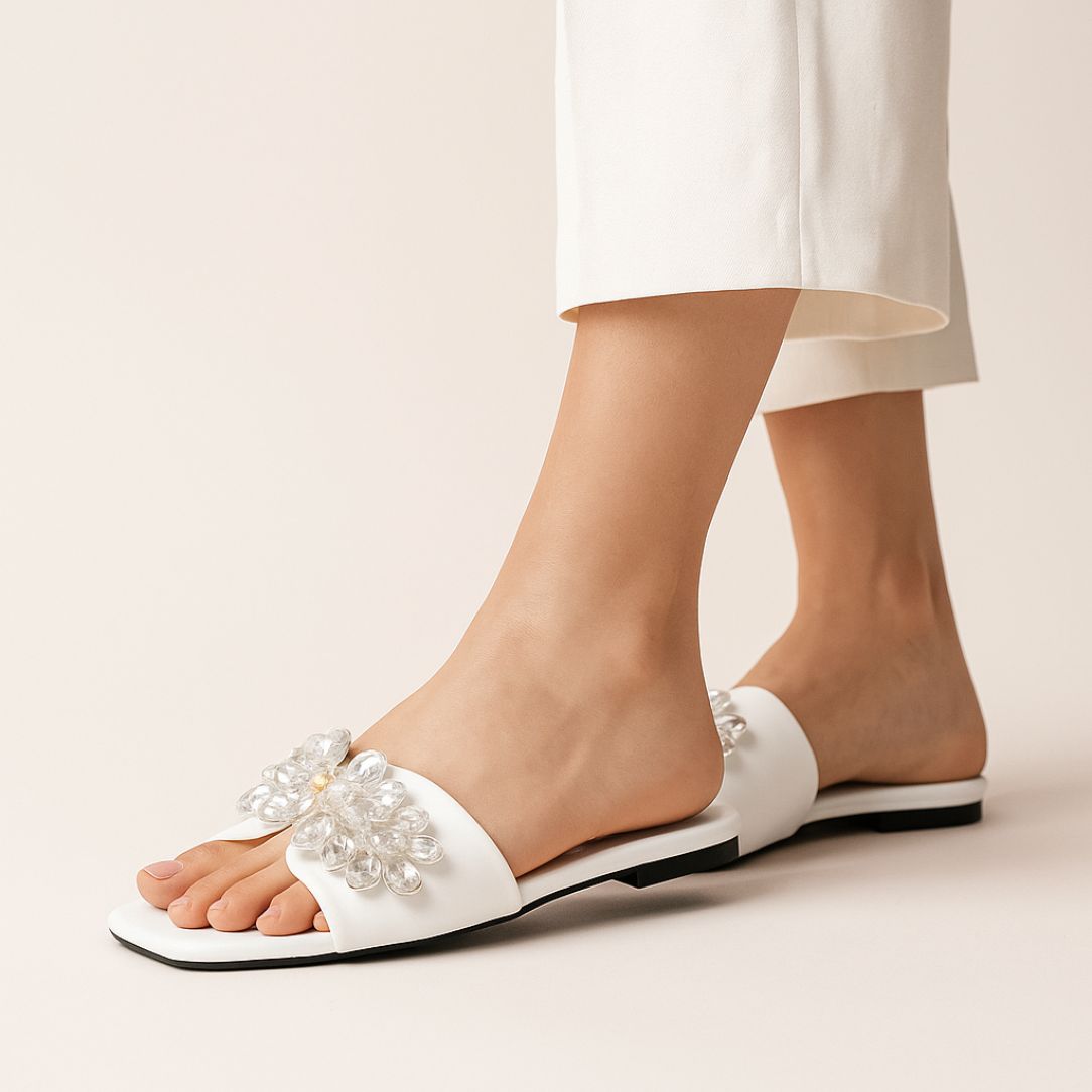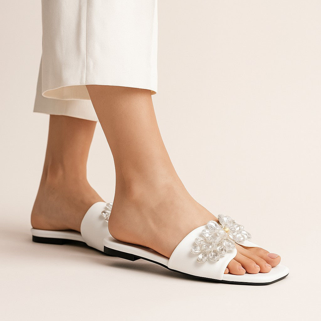 Step into elegance with these striking white slide sandals by ZAPATLA. Crafted with a sleek square-toe silhouette, this statement piece features a bold floral embellishment made from glossy white crystal beads and a touch of gold at the center, adding a hint of sparkle. The wide strap ensures a secure fit while elevating your look with chic sophistication—perfect for both casual outings and festive gatherings.