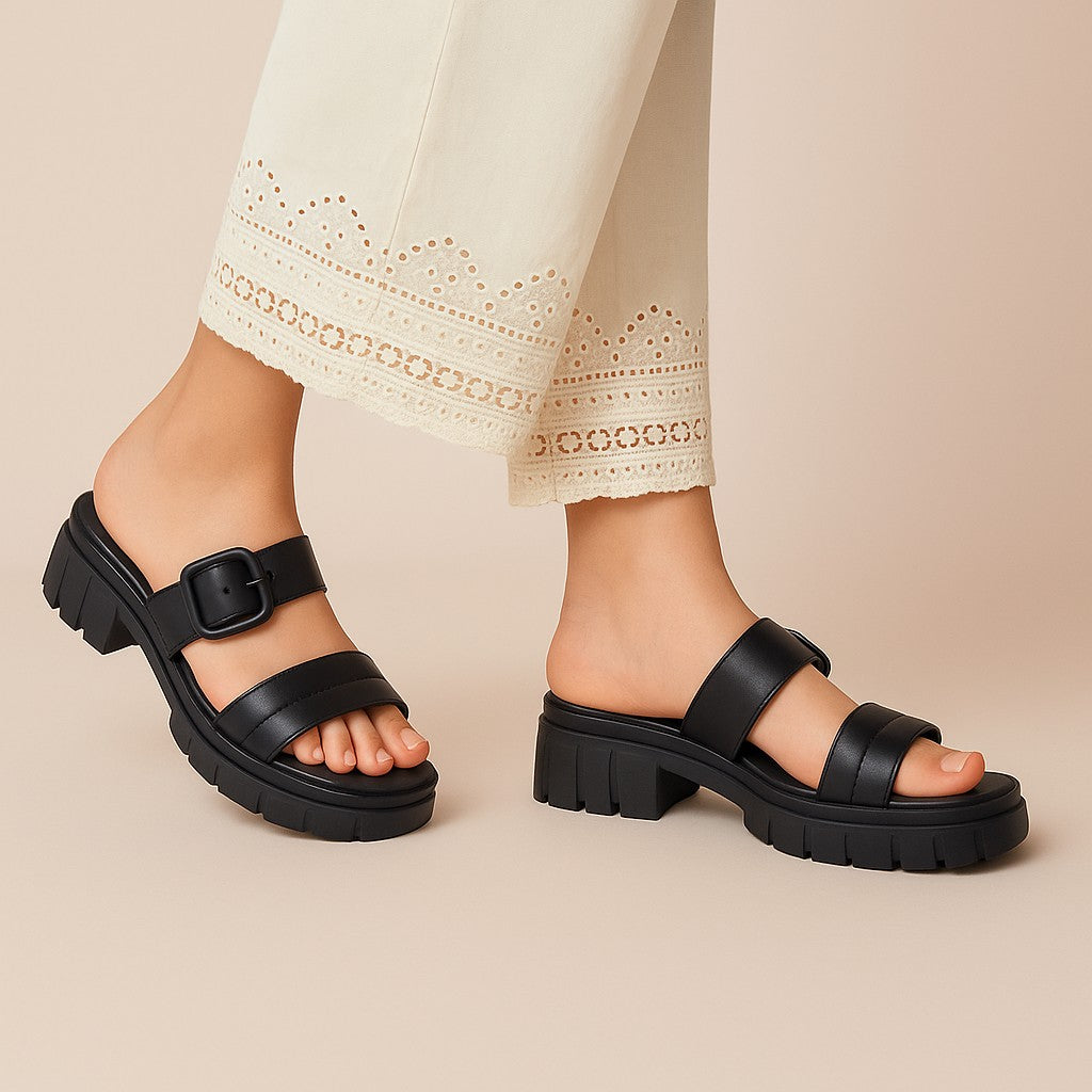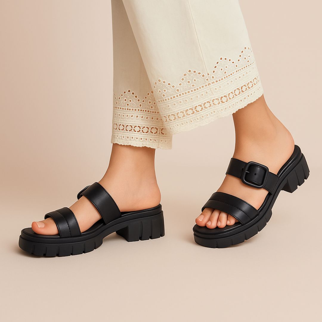 Step into effortless style with these Black double-strap sandals, designed for everyday comfort and modern flair. Featuring a bold buckle detail on the upper strap, cushioned insole, and chunky anti-slip sole, these sandals perfectly balance casual elegance with durability. Their versatile tan shade makes them easy to pair with jeans, dresses, or ethnic wear, making them a must-have for both daily wear and casual outings.