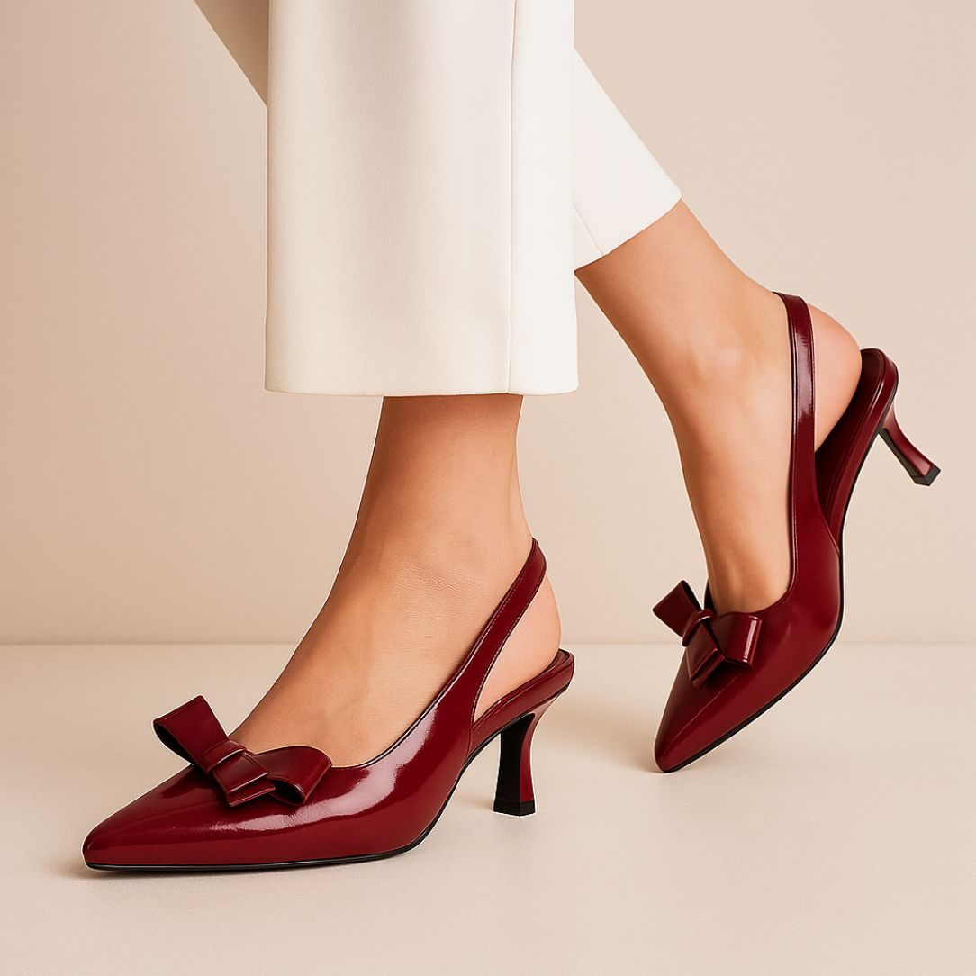 Step into elegance with these glossy burgundy maroon slingback heels, crafted in patent finish for a bold yet classy appeal. Designed with a sleek pointed toe, they feature a statement bow on the vamp for a touch of sophistication. The mid-height heel ensures all-day comfort, making them perfect for both formal and festive occasions.