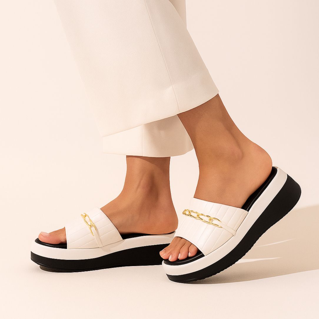 Step into everyday elegance with Zapatla’s Premium White Quilt-Chain Platform Slides—designed for women who love comfort with a touch of luxury. The soft quilt-patterned strap paired with a chic golden chain detail adds instant sophistication to your daily look. Built on a lightweight, cushioned platform sole, this slip-on provides height without compromising comfort, making it perfect for long walks, casual outings, office wear, or travel.